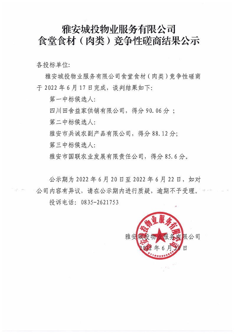 城投公司食堂食材(肉類)采購項目競爭性磋商結(jié)果公示