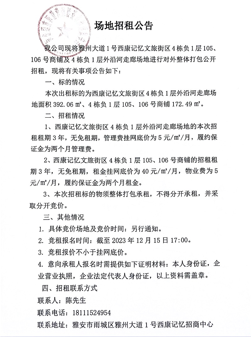 雅州大道1號(hào)西康記憶文旅街區(qū)4棟負(fù)1層105、106號(hào)商鋪及4棟負(fù)1層外沿河走廊場(chǎng)地招租公告