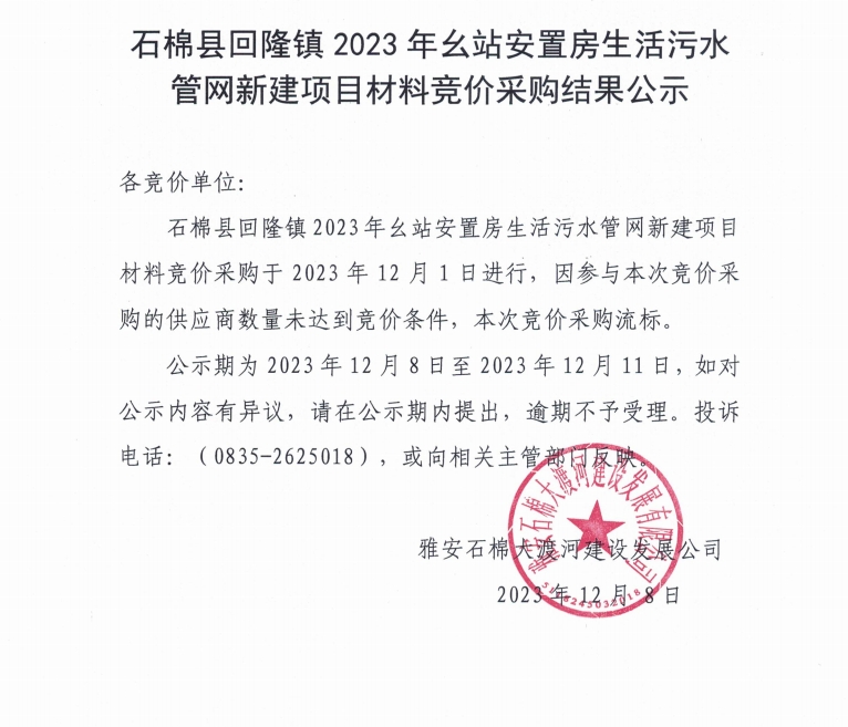 石棉縣回隆鎮(zhèn)2023年幺站安置房生活污水管網(wǎng)新建項目材料競價采購結(jié)果公示