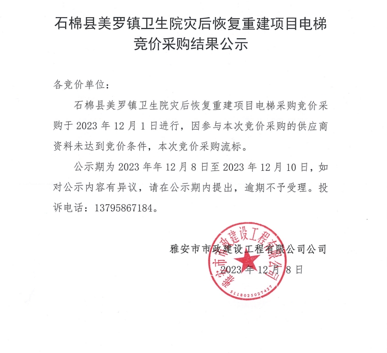 石棉縣美羅鎮(zhèn)衛(wèi)生院災(zāi)后恢復(fù)重建項(xiàng)目電梯競(jìng)價(jià)采購(gòu)結(jié)果公示