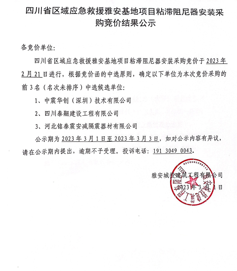 四川省區(qū)域應(yīng)急救援雅安基地項(xiàng)目粘滯阻尼器安裝采購(gòu)競(jìng)價(jià)結(jié)果公示