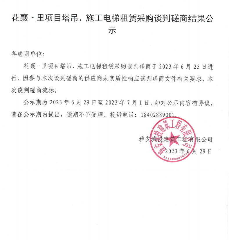 花襄·里項目塔吊、施工電梯租賃采購談判磋商結(jié)果公示