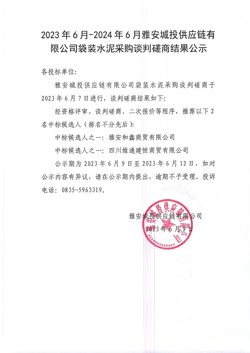 2023年6月-2024年6月雅安城投供應(yīng)鏈有限公司袋裝水泥采購(gòu)談判磋商結(jié)果公示