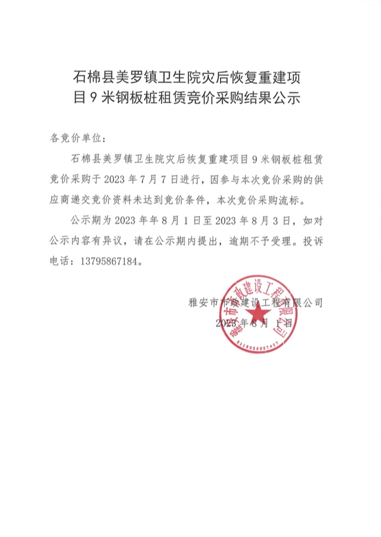 石棉縣美羅鎮(zhèn)衛(wèi)生院災后恢復重建項目9米鋼板樁租賃競價采購結果公示