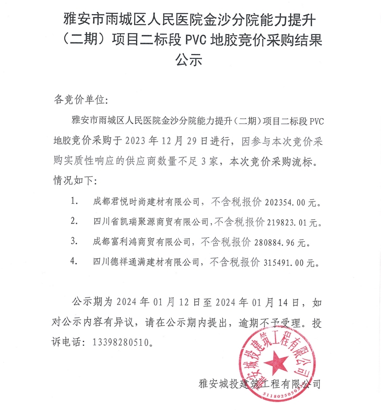 雅安市雨城區(qū)人民醫(yī)院金沙分院能力提升(二期)項目二標段PVC地膠競價采購結果公示