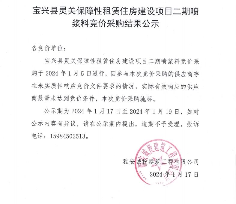 寶興縣靈關(guān)保障性租賃住房建設(shè)項(xiàng)目二期噴漿料競(jìng)價(jià)采購(gòu)結(jié)果公示