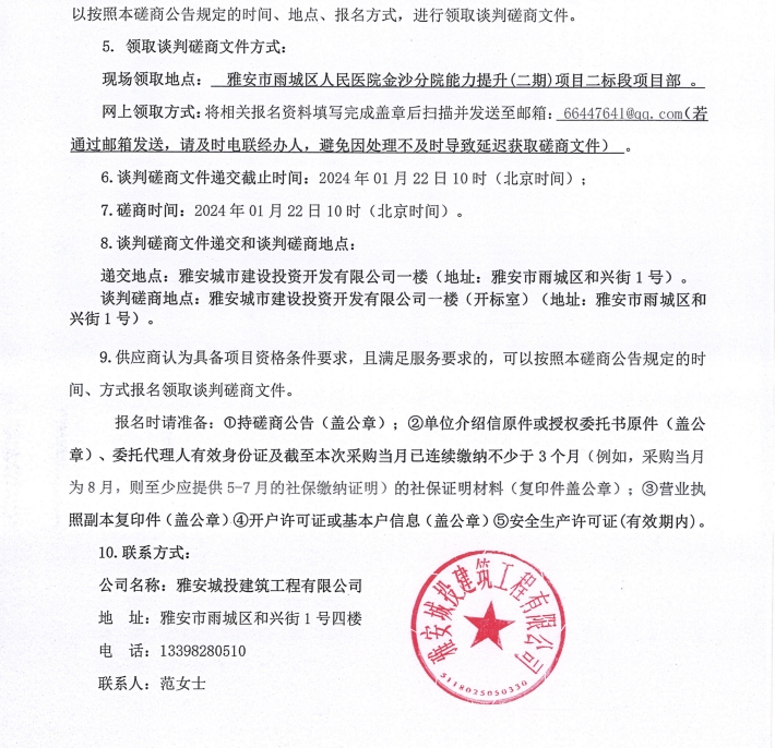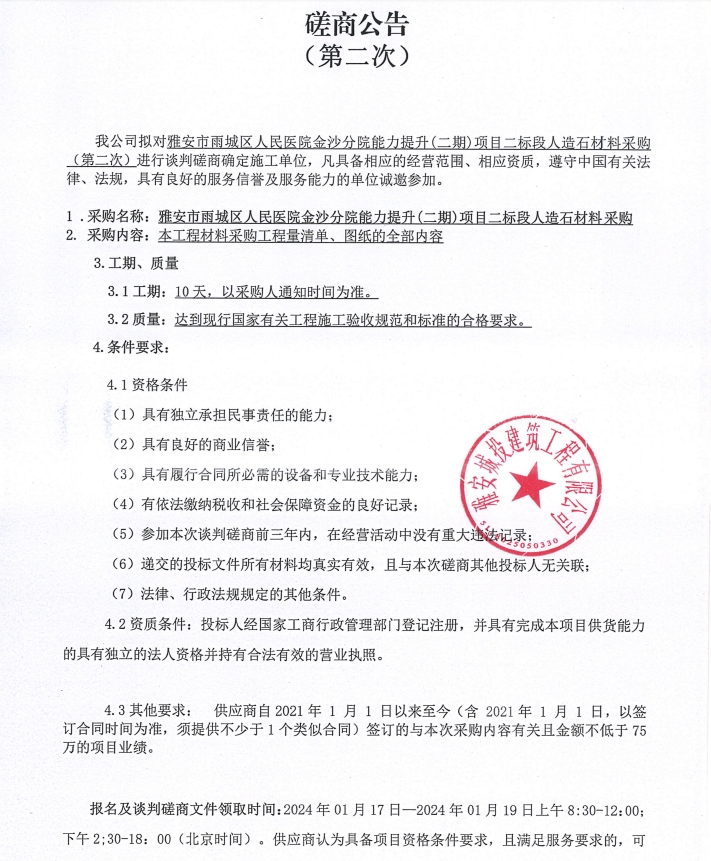 雅安市雨城區(qū)人民醫(yī)院金沙分院能力提升(二期)項目二標段人造石材料(第二次)采購談判磋商公告