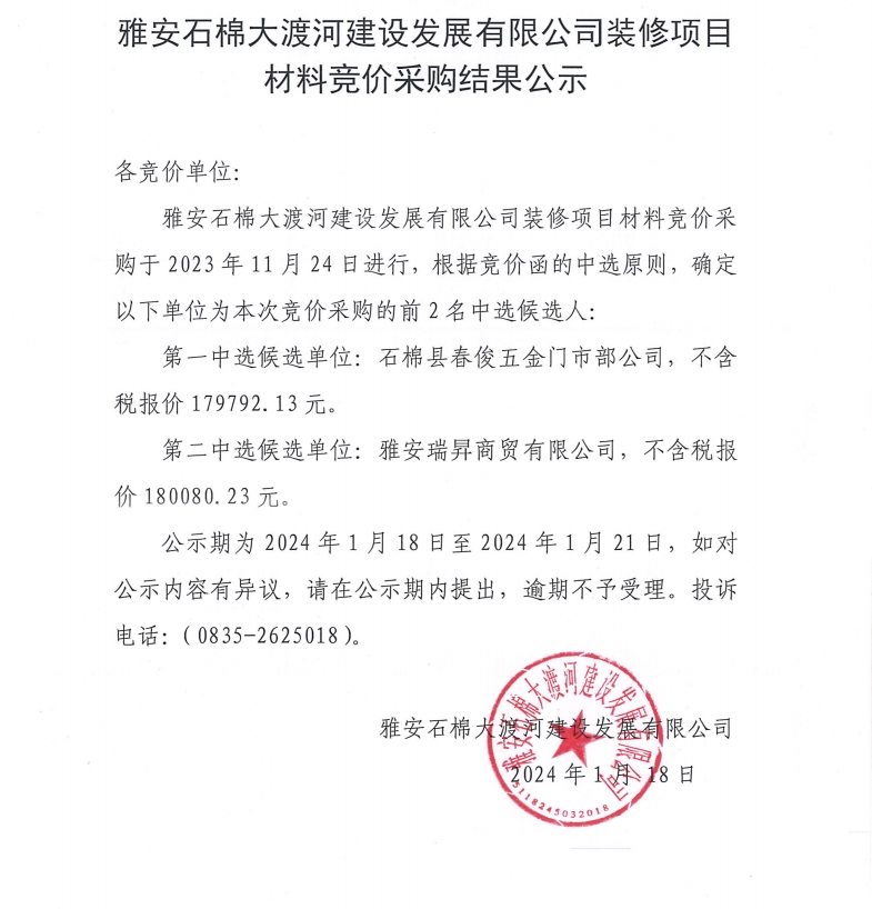 雅安石棉大渡河建設(shè)發(fā)展有限公司裝修材料競價(jià)采購結(jié)果公示