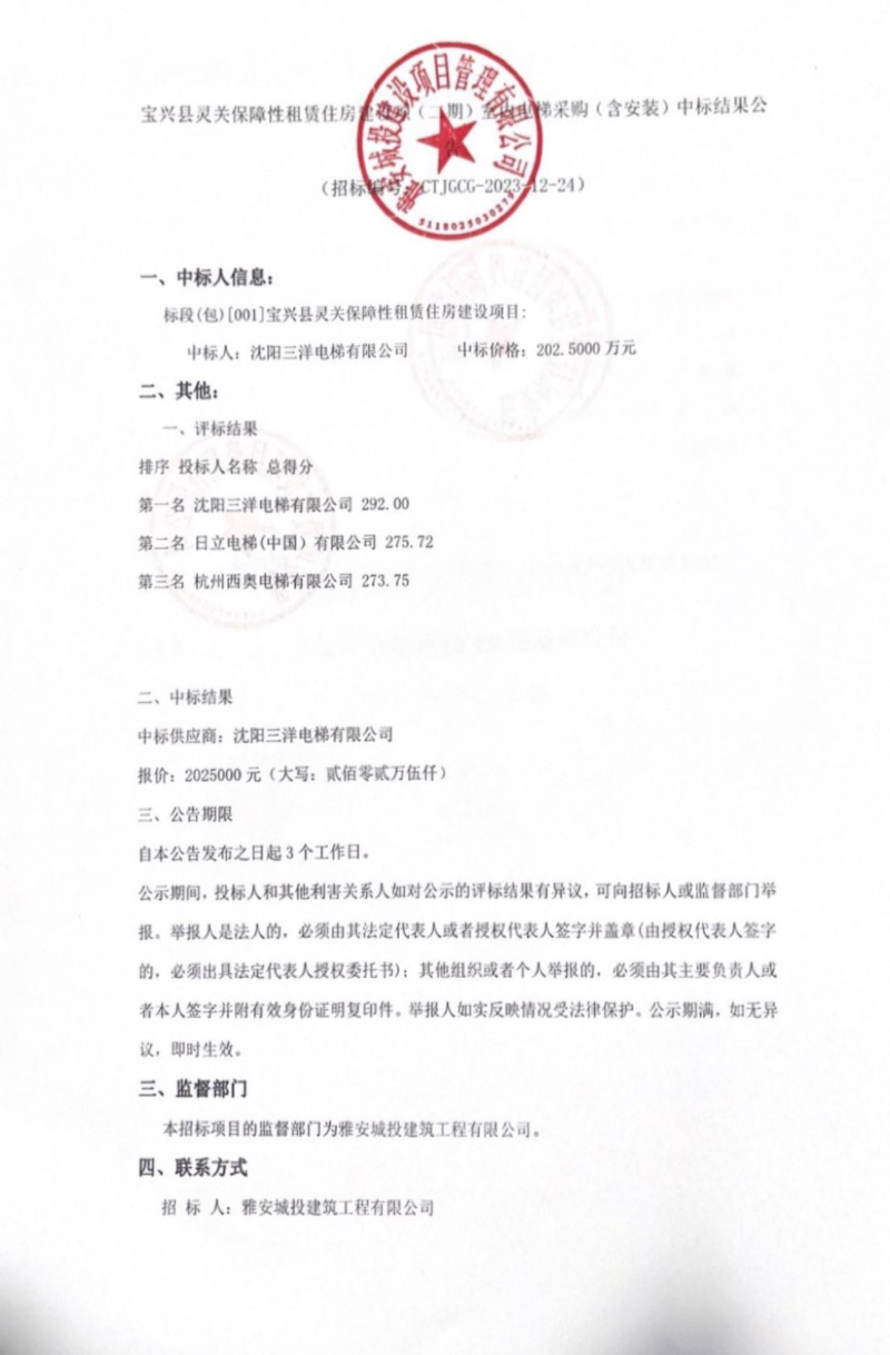 寶興縣靈關(guān)保障性租賃住房建設(shè)項(xiàng)目(二期)室內(nèi)電梯采購(gòu)(含安裝)中標(biāo)結(jié)果公示