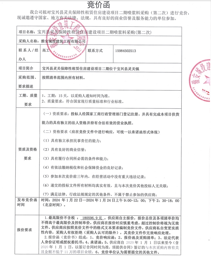 寶興縣靈關(guān)保障性租賃住房建設(shè)項(xiàng)目二期噴漿料采購(gòu)(第二次)競(jìng)價(jià)公告