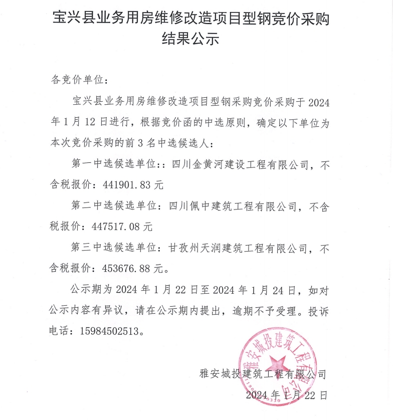 寶興縣業(yè)務(wù)用房維修改造項(xiàng)目型鋼競(jìng)價(jià)采購(gòu)結(jié)果公示