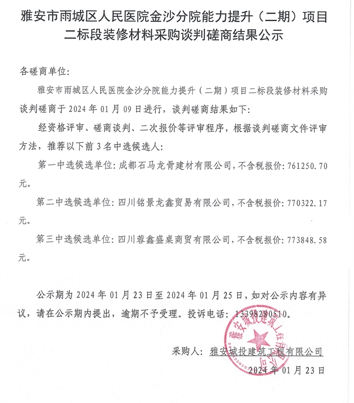 雅安市雨城區(qū)人民醫(yī)院金沙分院能力提升(二期)項目二標(biāo)段裝修材料采購談判磋商結(jié)果公示