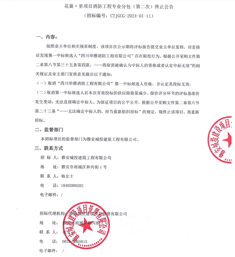 花襄·里項目消防工程專業(yè)分包(第二次)終止公告