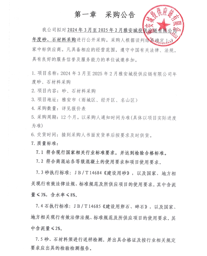 2024年3月至2025年2月雅安城投供應(yīng)鏈有限公司年度砂、石材料采購(gòu)公告