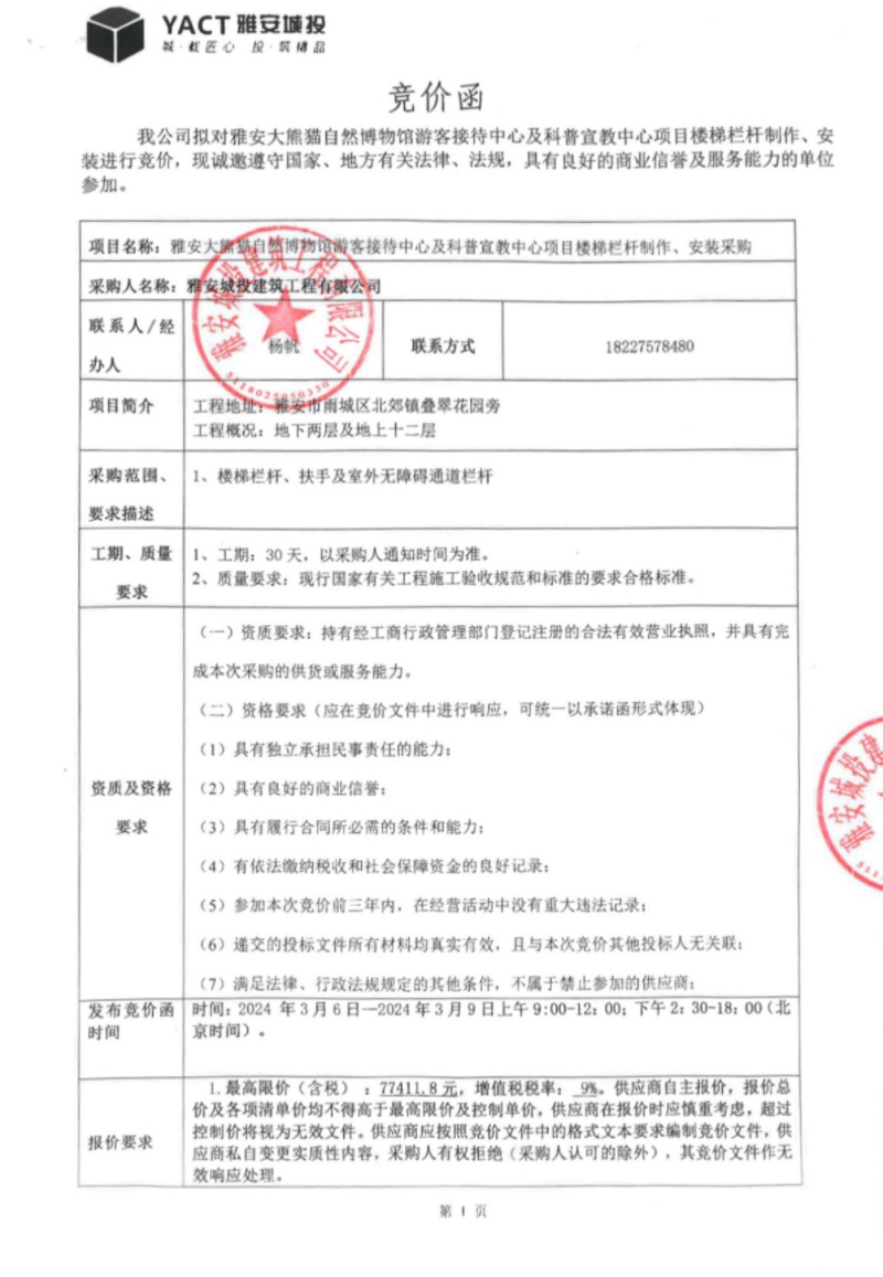 雅安大熊貓自然博物館游客接待中心及科普宣教中心項目樓梯欄桿制作、安裝采購競價公告