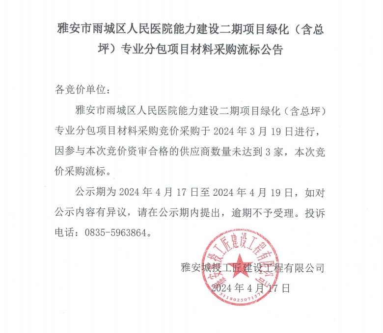 雅安市雨城區(qū)人民醫(yī)院能力建設(shè)二期項目綠化(含總坪)專業(yè)分包項目材料采購流標(biāo)公告