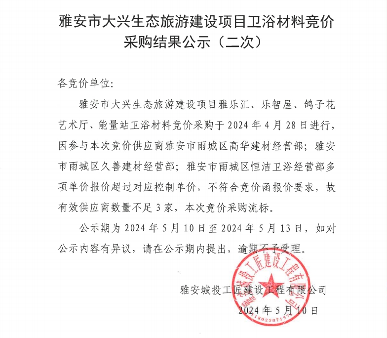 雅安市大興生態(tài)旅游建設(shè)項(xiàng)目衛(wèi)浴材料競(jìng)價(jià)采購(gòu)結(jié)果公示(二次)