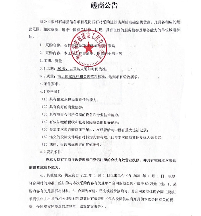 石棉縣儲(chǔ)備項(xiàng)目花崗石石材采購(gòu)磋商公告