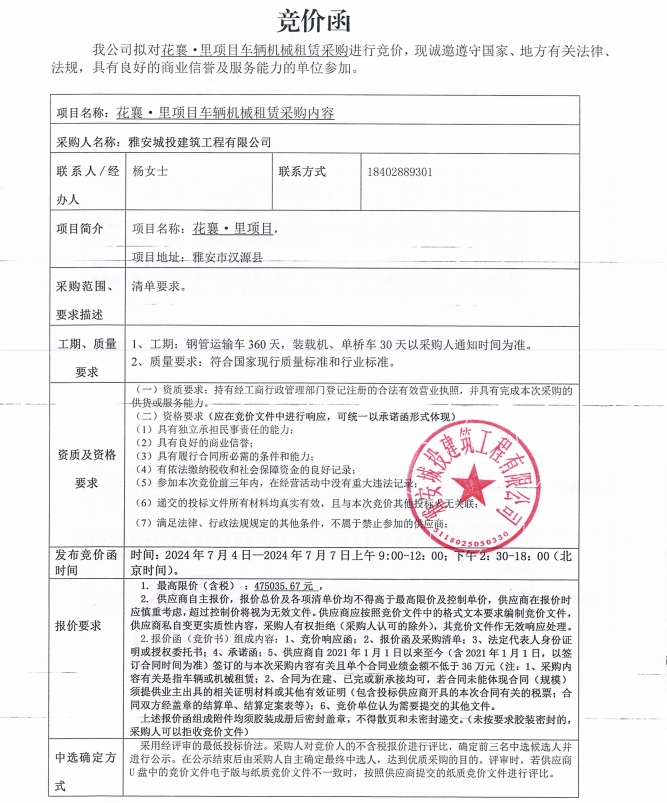 花襄·里項(xiàng)目車輛機(jī)械租賃采購競價(jià)公告