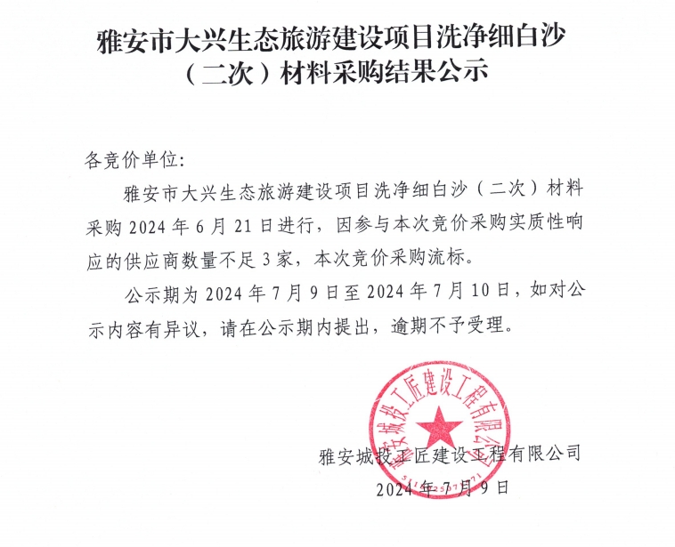 雅安市大興生態(tài)旅游建設(shè)項(xiàng)目洗凈細(xì)白沙(二次)材料采購(gòu)結(jié)果公示